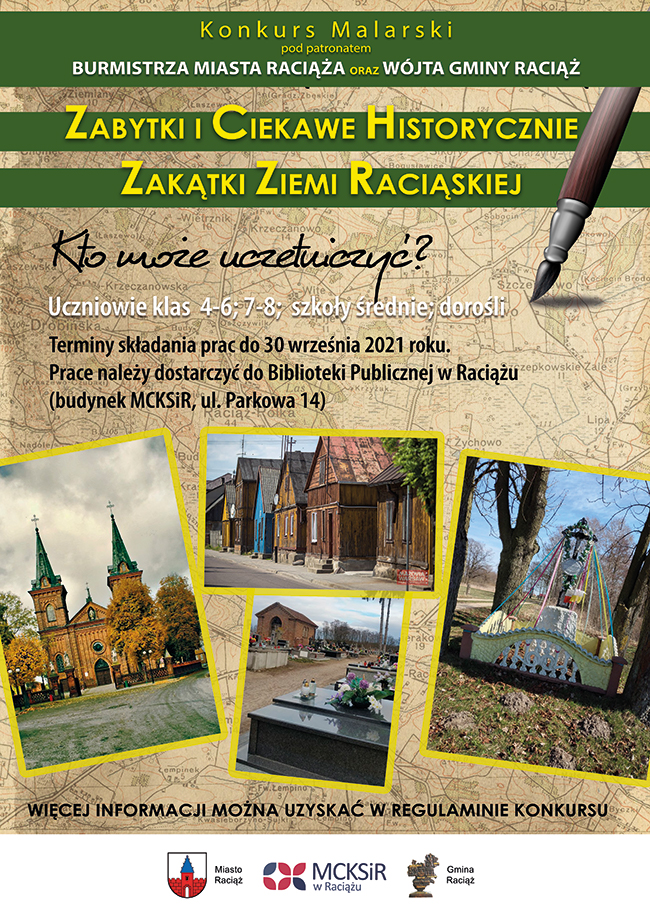 Zapraszamy do udziału w konkursie malarskim pod patronatem Burmistrza Miasta Raciąża oraz Wójta Gminy Raciąż pn. "Zabytki i Ciekawe Historycznie Zakątki Ziemi Raciąskiej"